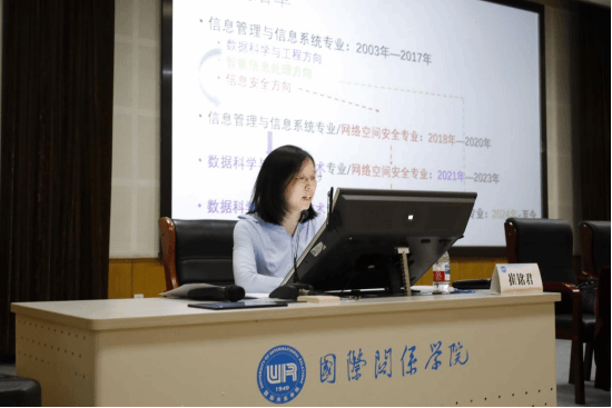 数据科学与人工智能教研室主任郭宇红老师向新生及其家长介绍了数据科学与大数据技术专业及人工智能专业的基本情况,包括了课程架构、师资队伍等关键信息,并特别强调了学生需培养扎实的编程技能,致力于成为具有国际视野、心系国家的计算机专业领域人才。